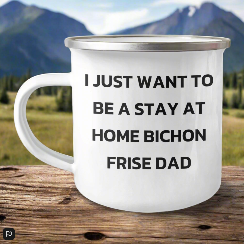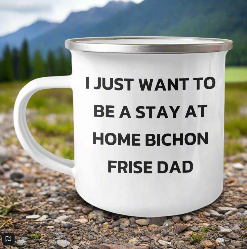 Are you a Bichon Frise dog enthusiast looking for a unique gift for your dad who loves the outdoors? Look no further! This camping mug is the perfect way to show your dad that you care. With its 12 oz capacity and stainless steel with enamel finish, this mug is both sturdy and stylish. The permanent printing won't fade after washing, ensuring that your dad can enjoy his favorite quote, 'I Just Want To Be A Stay At Home Bichon Frise Dad', for years to come. Whether you're looking for a Father's Day gift or just a thoughtful present, this camping mug is sure to delight. So why wait? Don't miss out and make your dad's day!