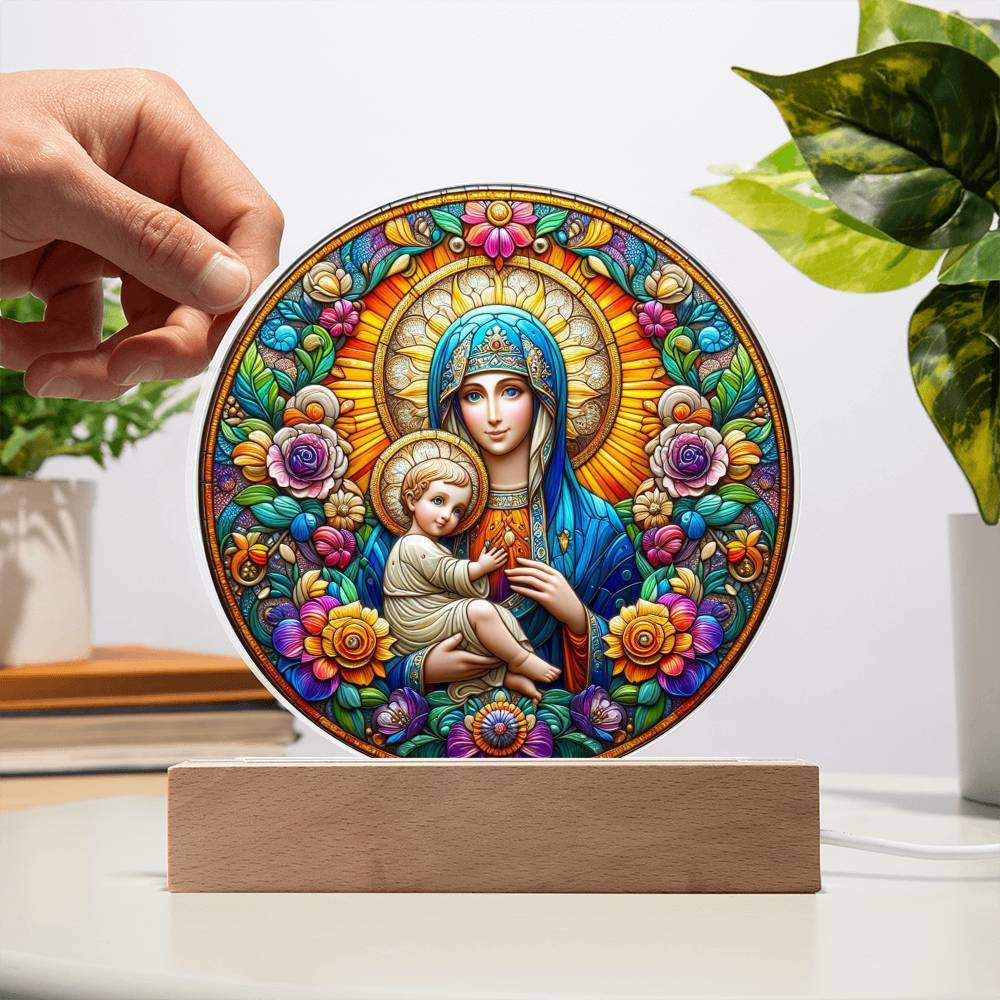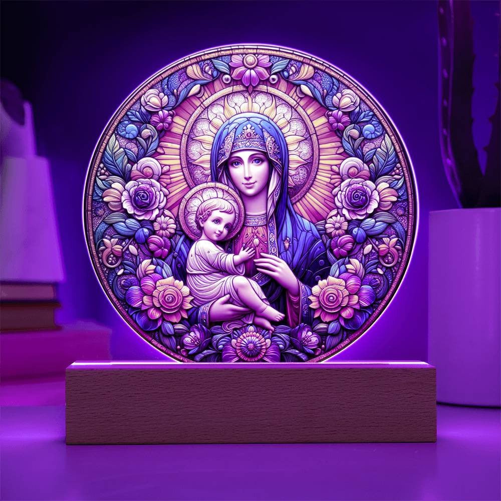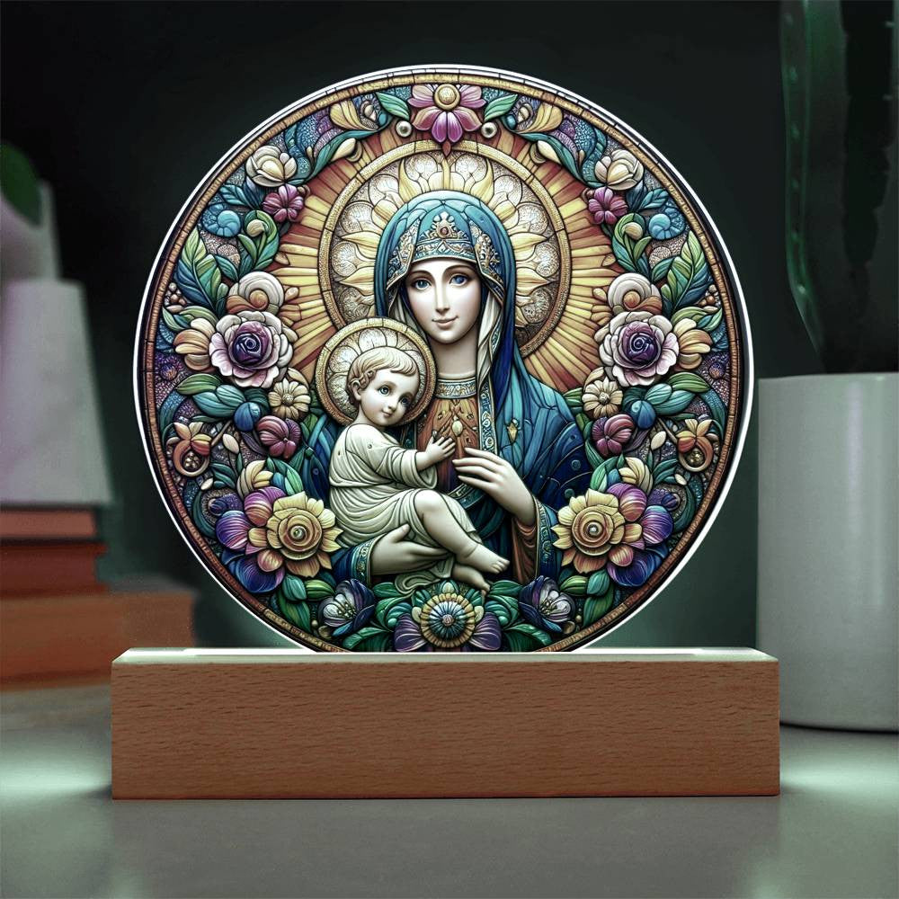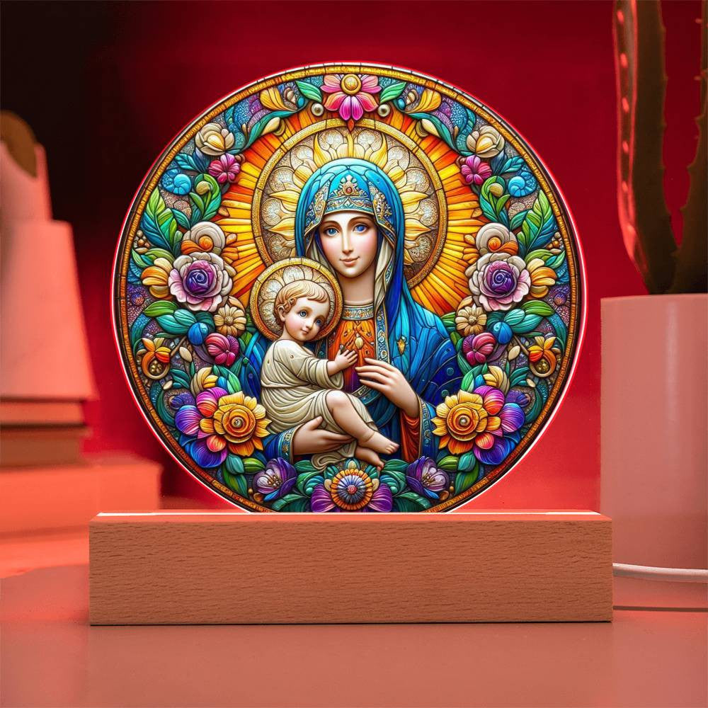 *AI generated image.Bring the serene beauty of religious artwork into your home with this exquisite Mary and Baby Jesus stained glass style plaque. Perfect Christian teacher gift or for priests, youth pastors, and anyone who appreciates Catholic artwork, this custom stained glass style piece captures the essence of faith and love. The modern stained glass design adds a touch of elegance to any room while serving as a reminder that Jesus is King and loves you. Whether you're looking for a unique gift for an Orthodox Christian or simply want to adorn your space with Virgin Mary art (Virgencita in Spanish), this LED nightlight plaque is a timeless and meaningful addition to your decor.