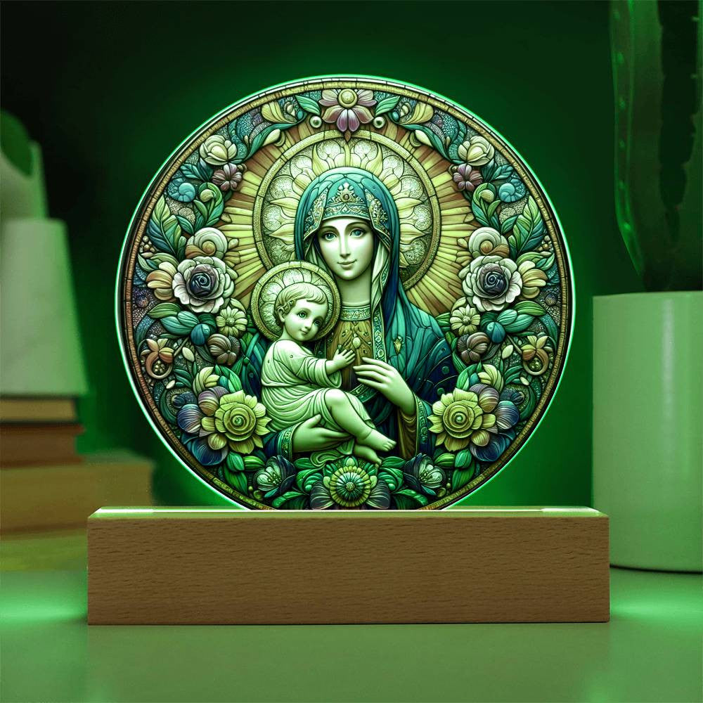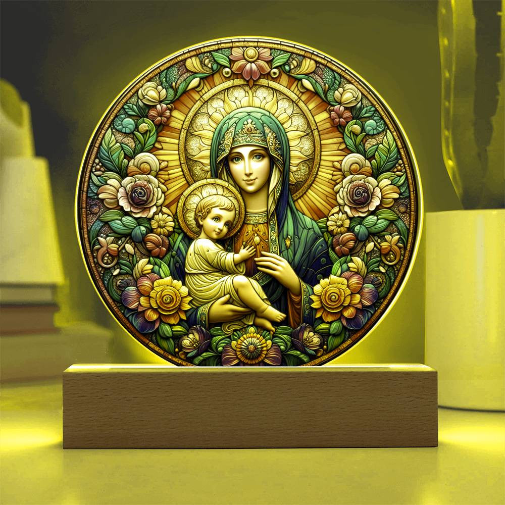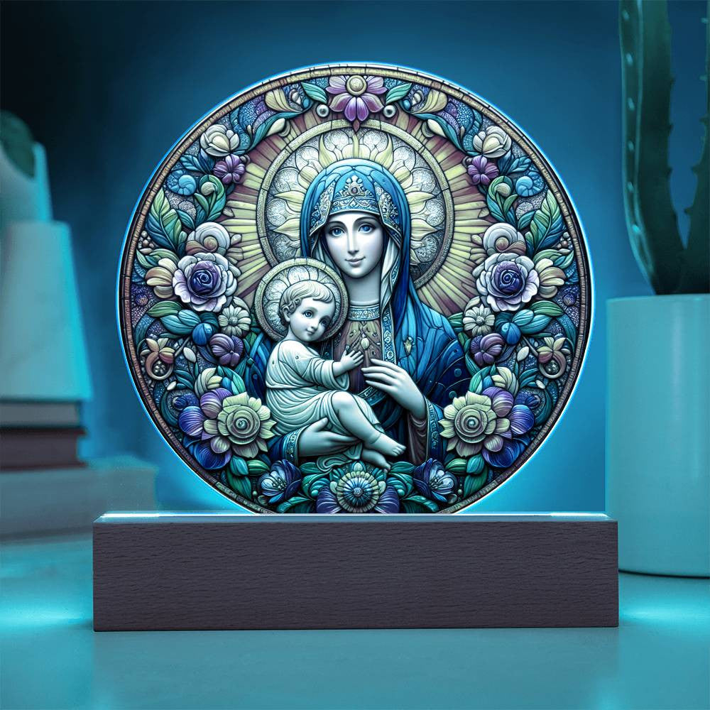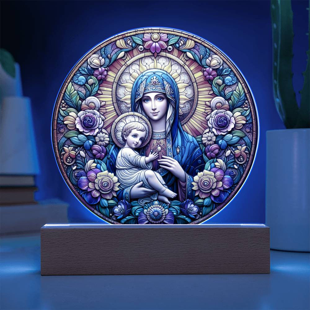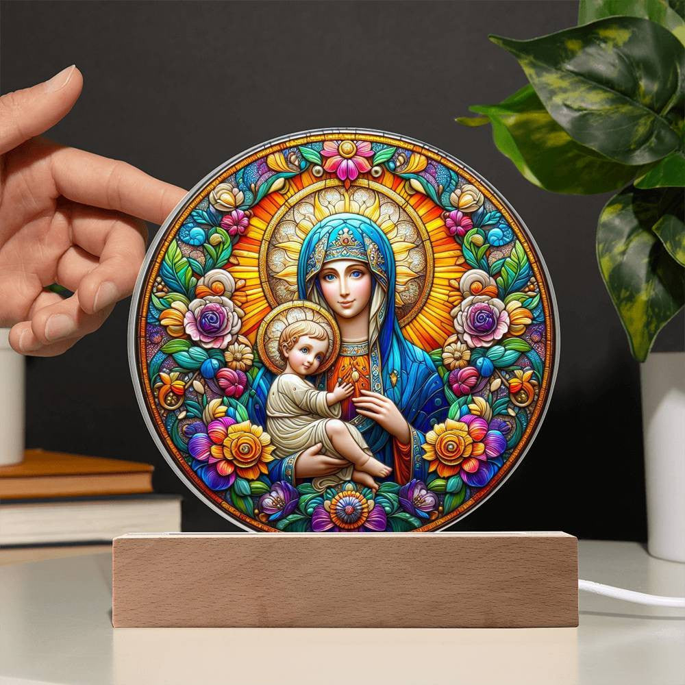 *AI generated image.Bring the serene beauty of religious artwork into your home with this exquisite Mary and Baby Jesus stained glass style plaque. Perfect Christian teacher gift or for priests, youth pastors, and anyone who appreciates Catholic artwork, this custom stained glass style piece captures the essence of faith and love. The modern stained glass design adds a touch of elegance to any room while serving as a reminder that Jesus is King and loves you. Whether you're looking for a unique gift for an Orthodox Christian or simply want to adorn your space with Virgin Mary art (Virgencita in Spanish), this LED nightlight plaque is a timeless and meaningful addition to your decor.