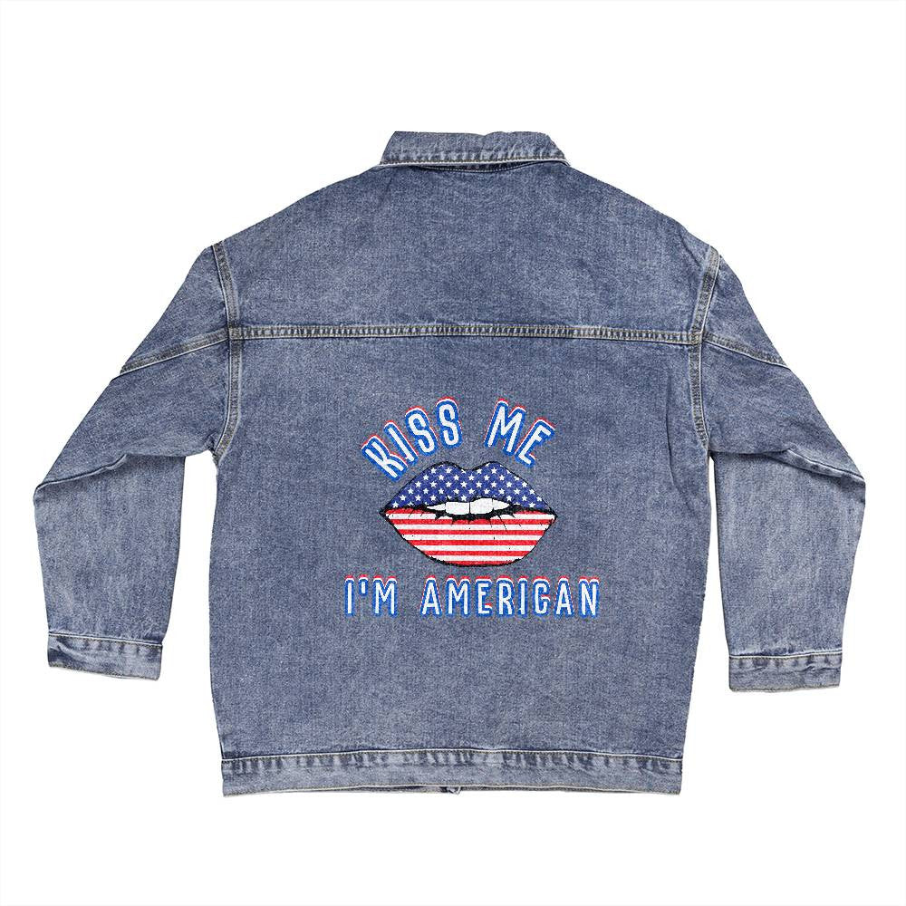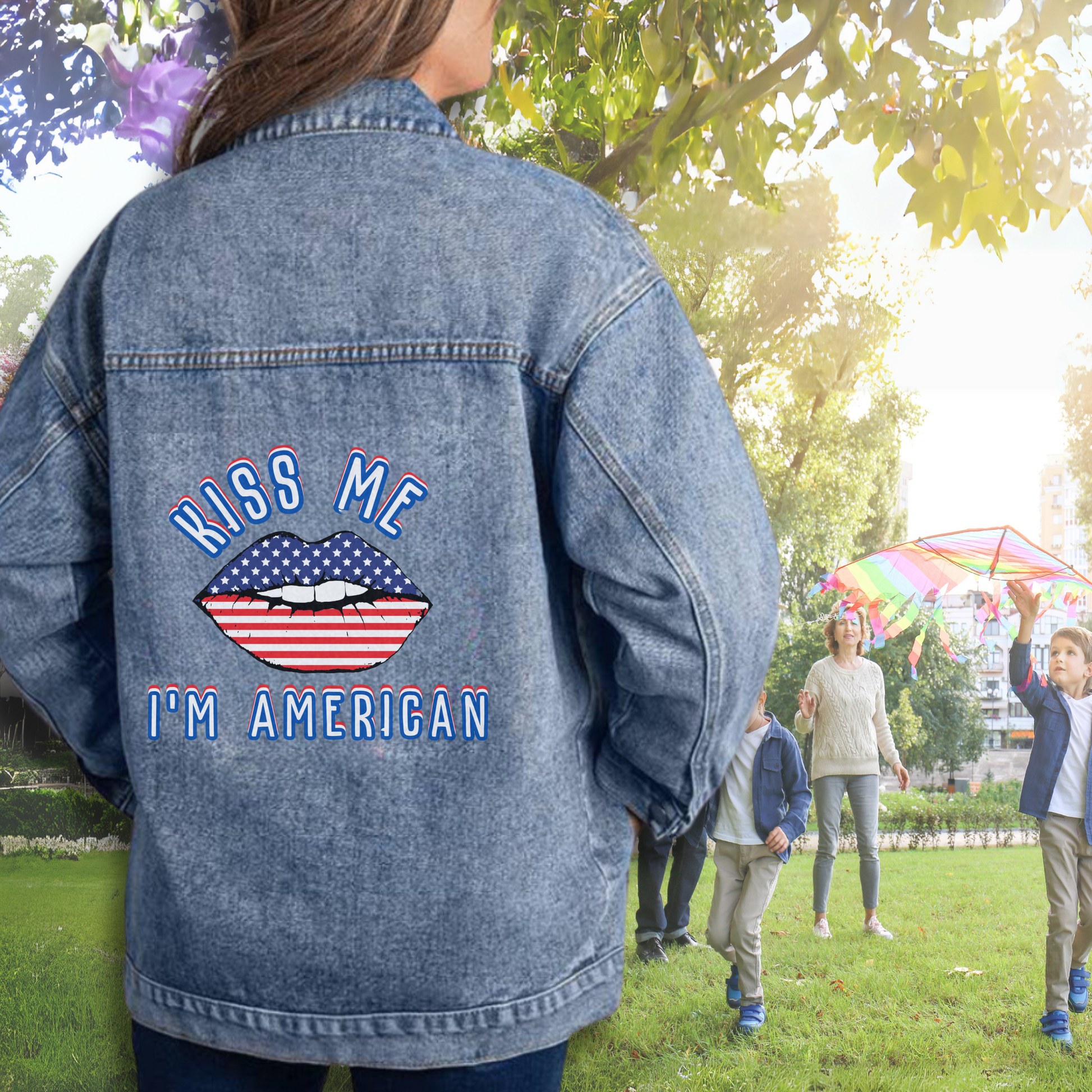 Celebrate the special women in your life with a custom "Kiss Me I'm American" denim jacket, the perfect gift for moms, wives, girlfriends, sisters, or any cool mom figure you cherish. This personalized denim jacket not only makes a unique birthday or Mother's Day gift but also a thoughtful present for stepmoms, bonus moms, or second moms who hold a special place in your heart. Show the best mom ever how much you care with this stylish and on-trend custom jean jacket, designed to make her feel loved and appreciated every time she wears it. Surprise her with a thoughtful gift that she will adore and cherish for years to come.