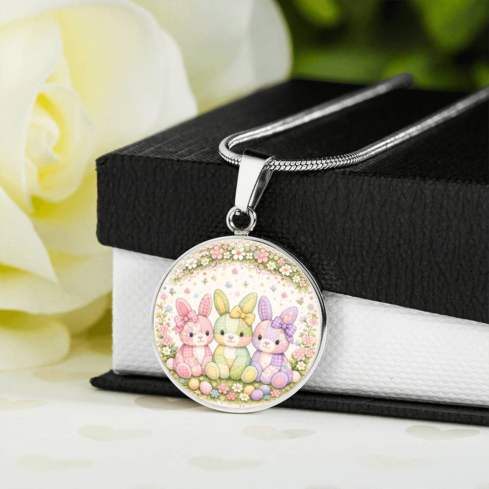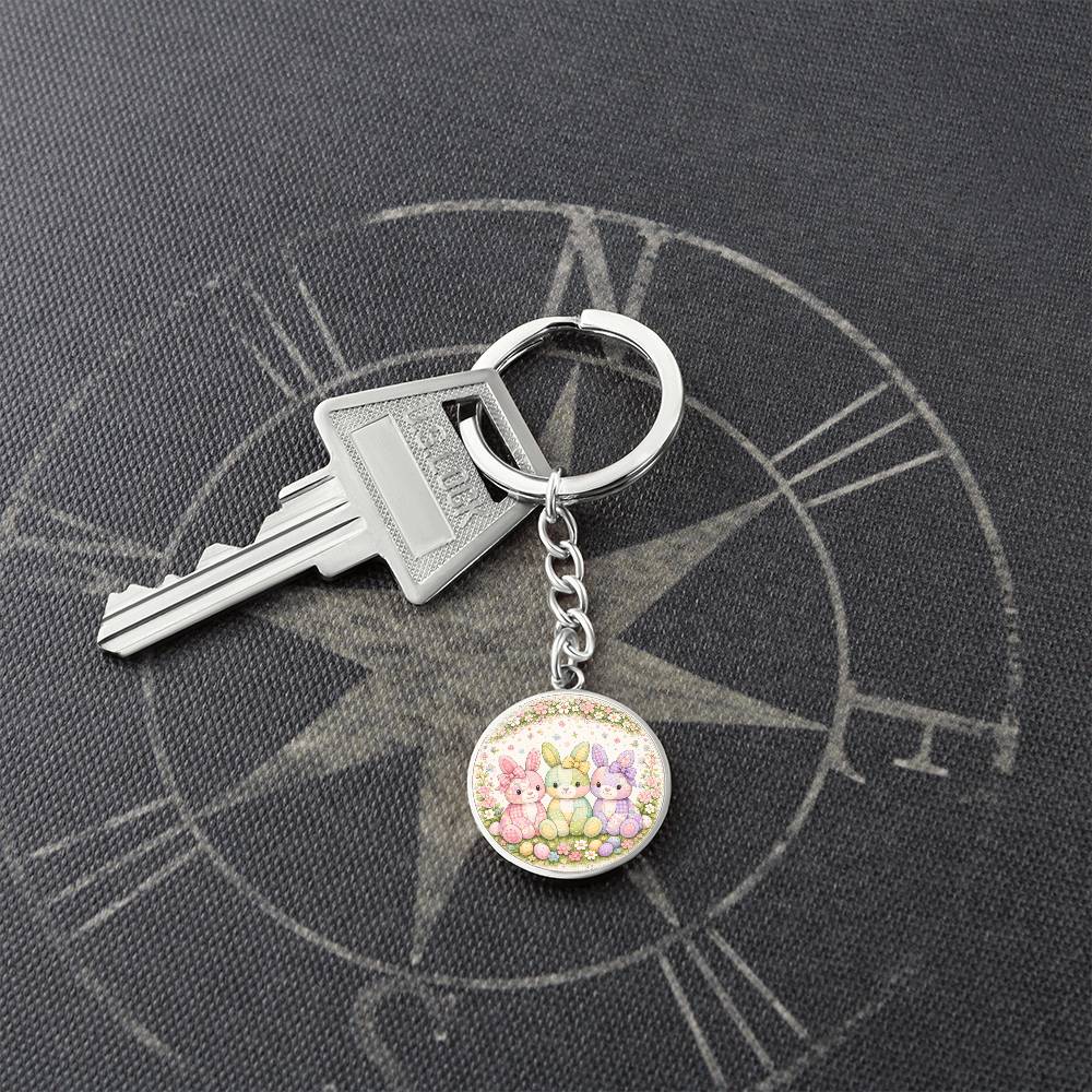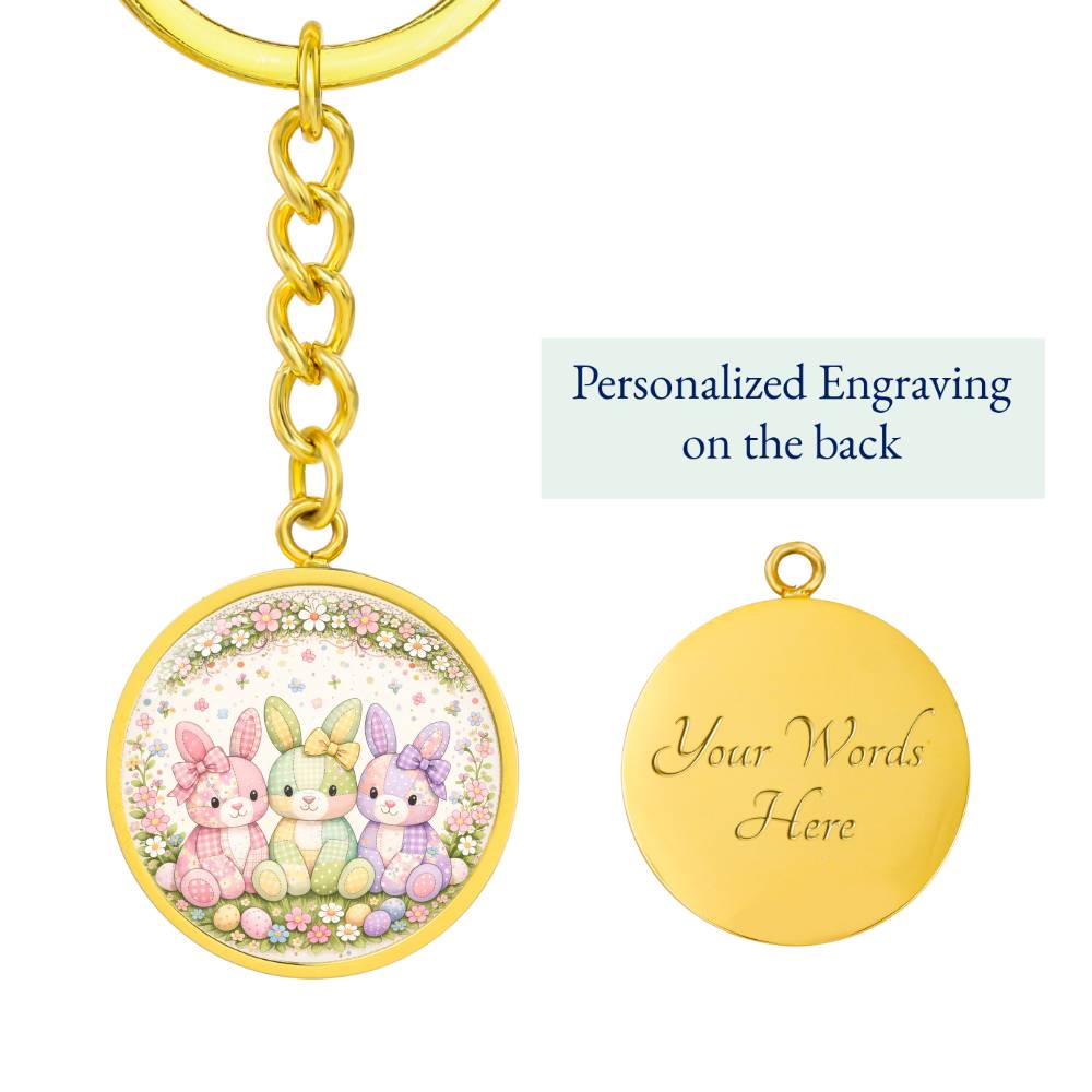 A charming floral bunny necklace or keychain featuring three adorable pastel bunnies surrounded by a delicate wreath of spring flowers and colorful Easter eggs. Each bunny is decorated with soft patchwork patterns and sweet bows, creating a cheerful storybook-style Easter design.