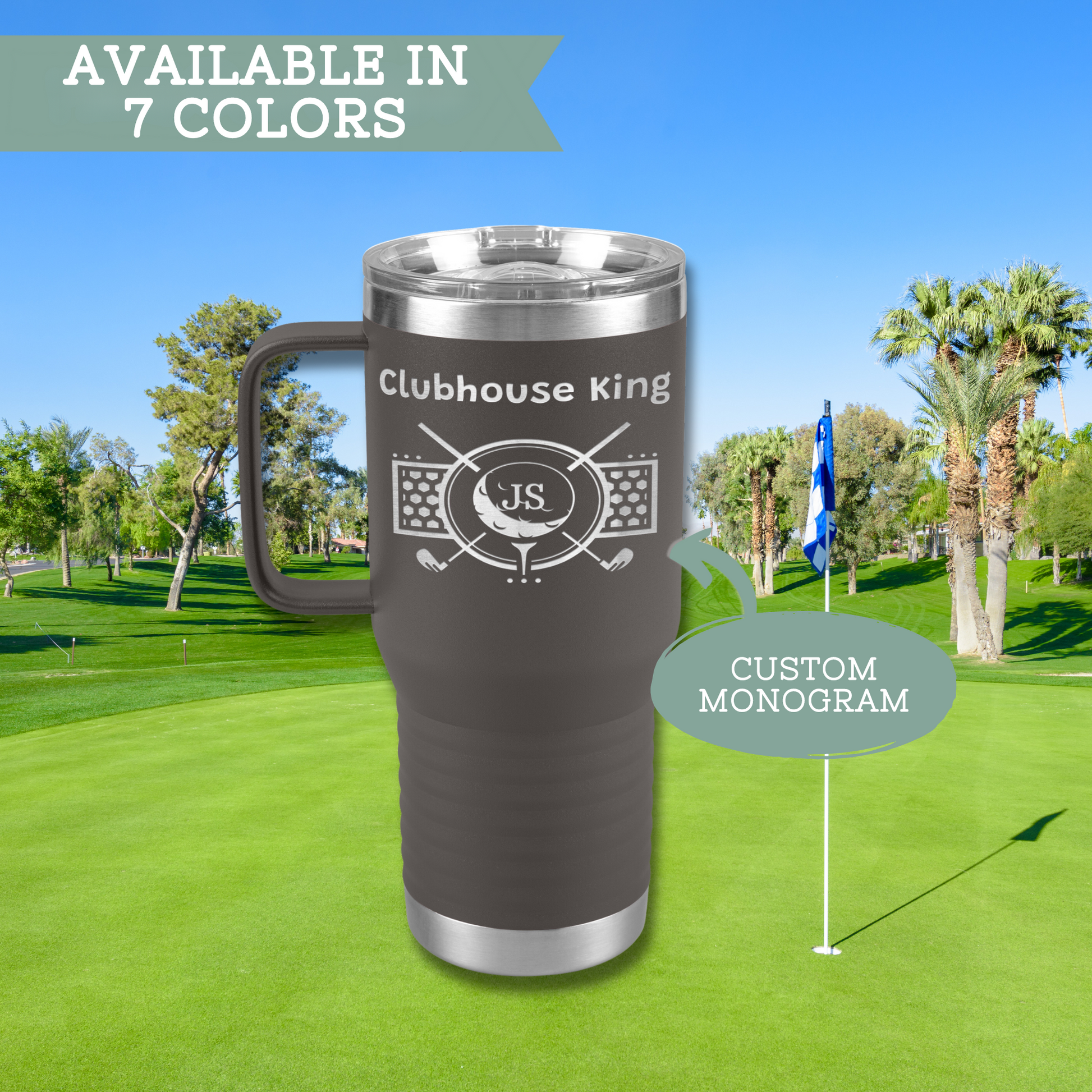 Surprise the special man in your life with a unique and personalized gift that combines his love for golf and a touch of old-money aesthetic. Our "Clubhouse King" customizable tumbler with a golf ball marker is the perfect golf birthday, Christmas or Father's Day gift for dads, husbands, grandpas, uncles, brothers or for any golf enthusiast. This custom golf gift not only celebrates the best grandpa or dad by par but also ensures he enjoys his favorite drink in style. With a practical yet thoughtful design, this golf mug is a fantastic way to show your appreciation to the father figure in your life while also adding a touch of elegance to his golf game.