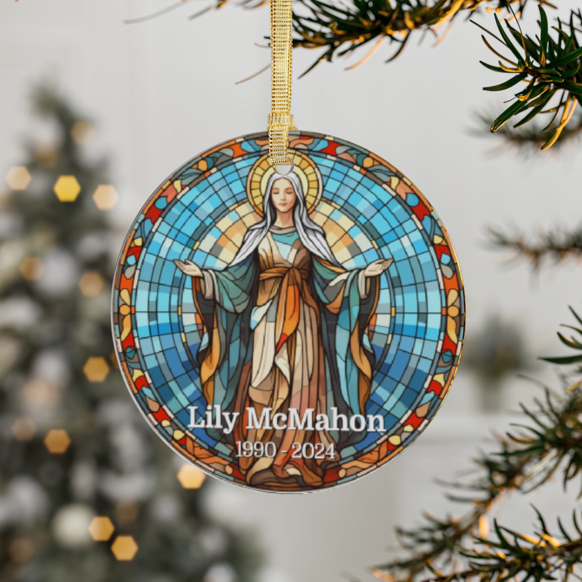 - Includes gold ribbon for hanging