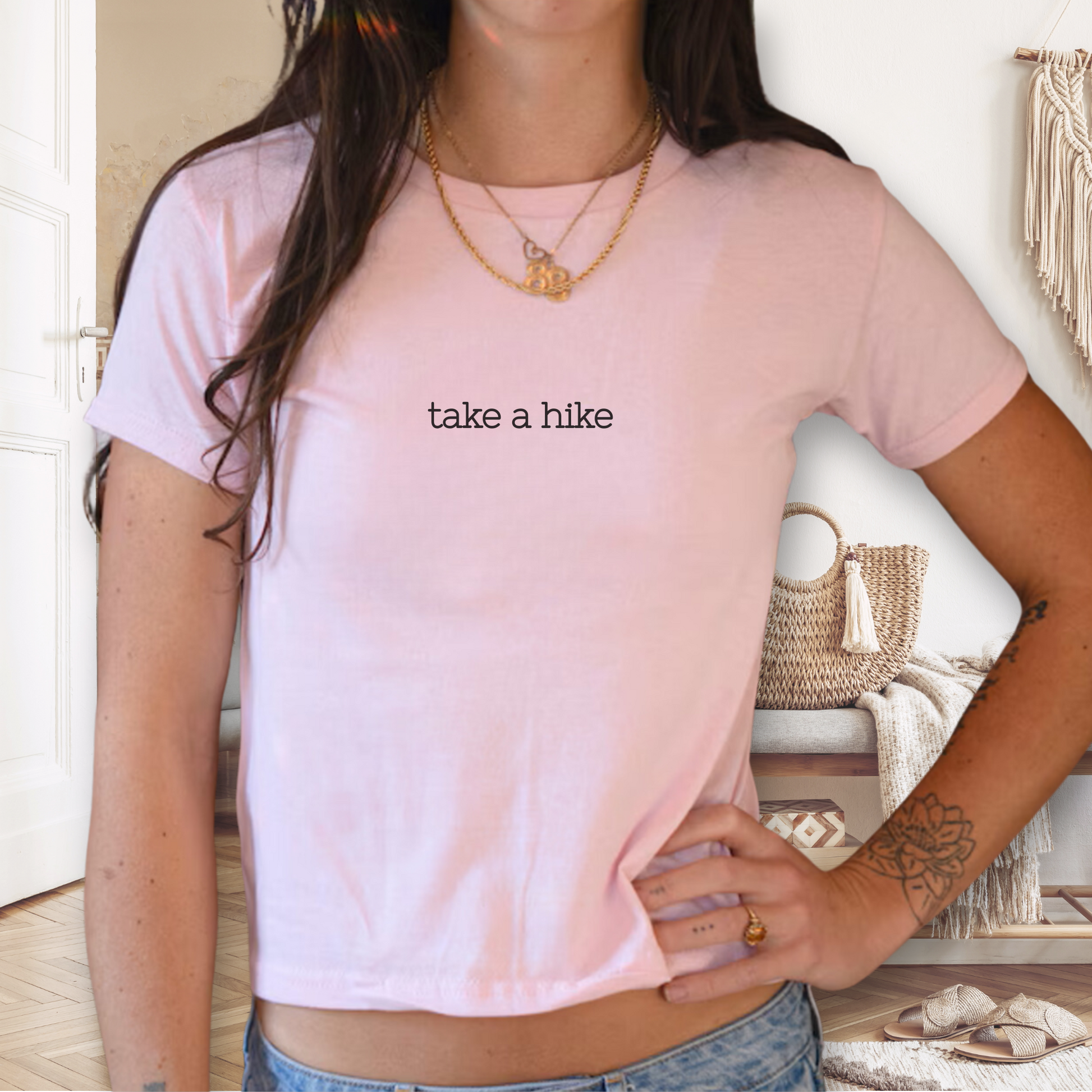 Inject a playful attitude and style into your wardrobe with this Sarcastic Humor Baby Tee. This "Take a Hike Baby Tee" is a y2k-inspired crop top and features a bold graphic design, perfect for those who appreciate funny adult shirts with a touch of sass. Whether you're looking for a cute gift for a girlfriend or just want to add some attitude to your style, this sarcastic t-shirt is a must-have. Step up your custom y2k fashion game and grab this raunchy yet cute baby tee that will surely turn heads. Add some cyber y2k flair to your 90s collection with shirts that go hard and showcase your unique aesthetic.