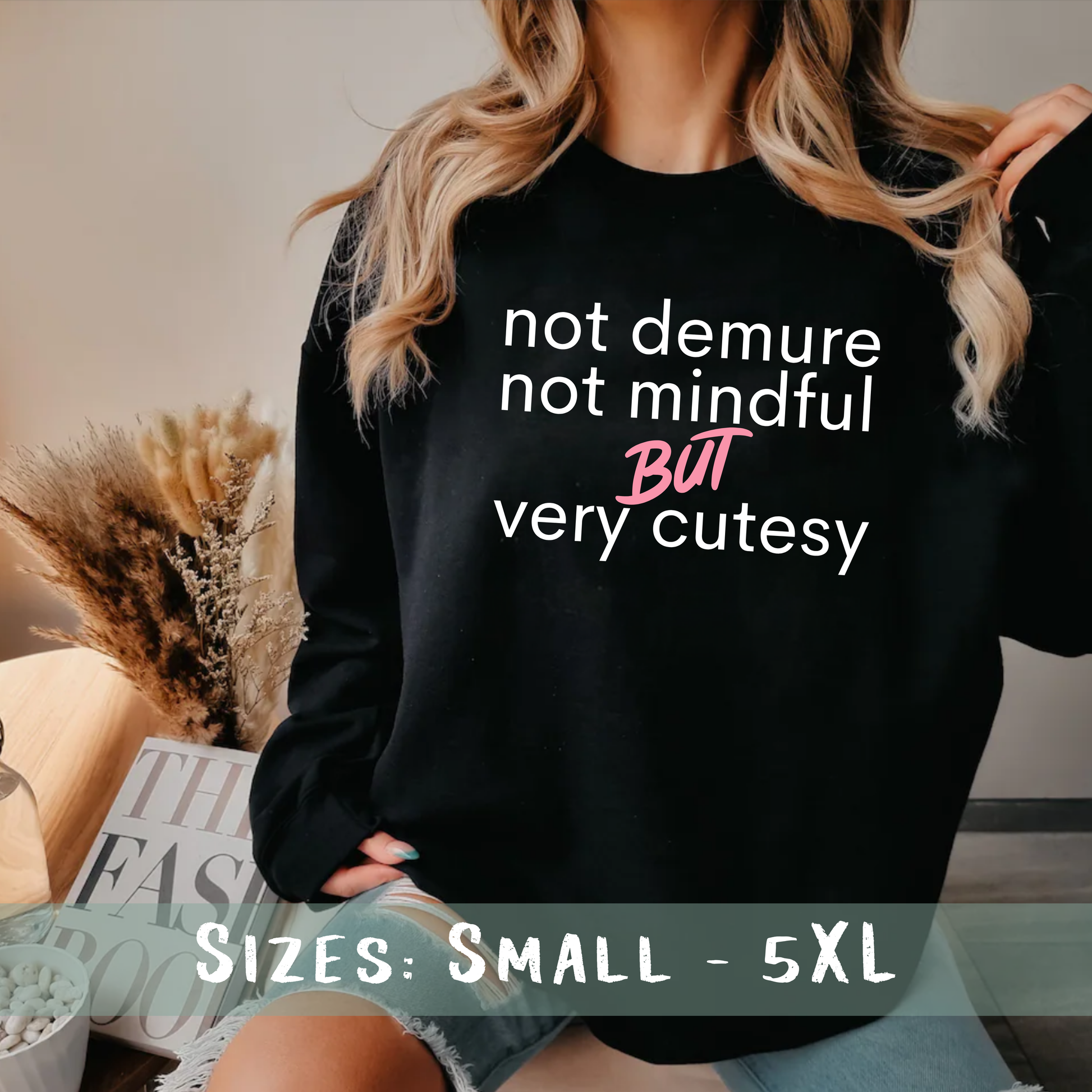 Not Demure Not Mindful But Very Cutesy Crewneck Sweatshirt! Wear this very cutesy sweatshirt and look very demure! Not like those other girls. Not too much!