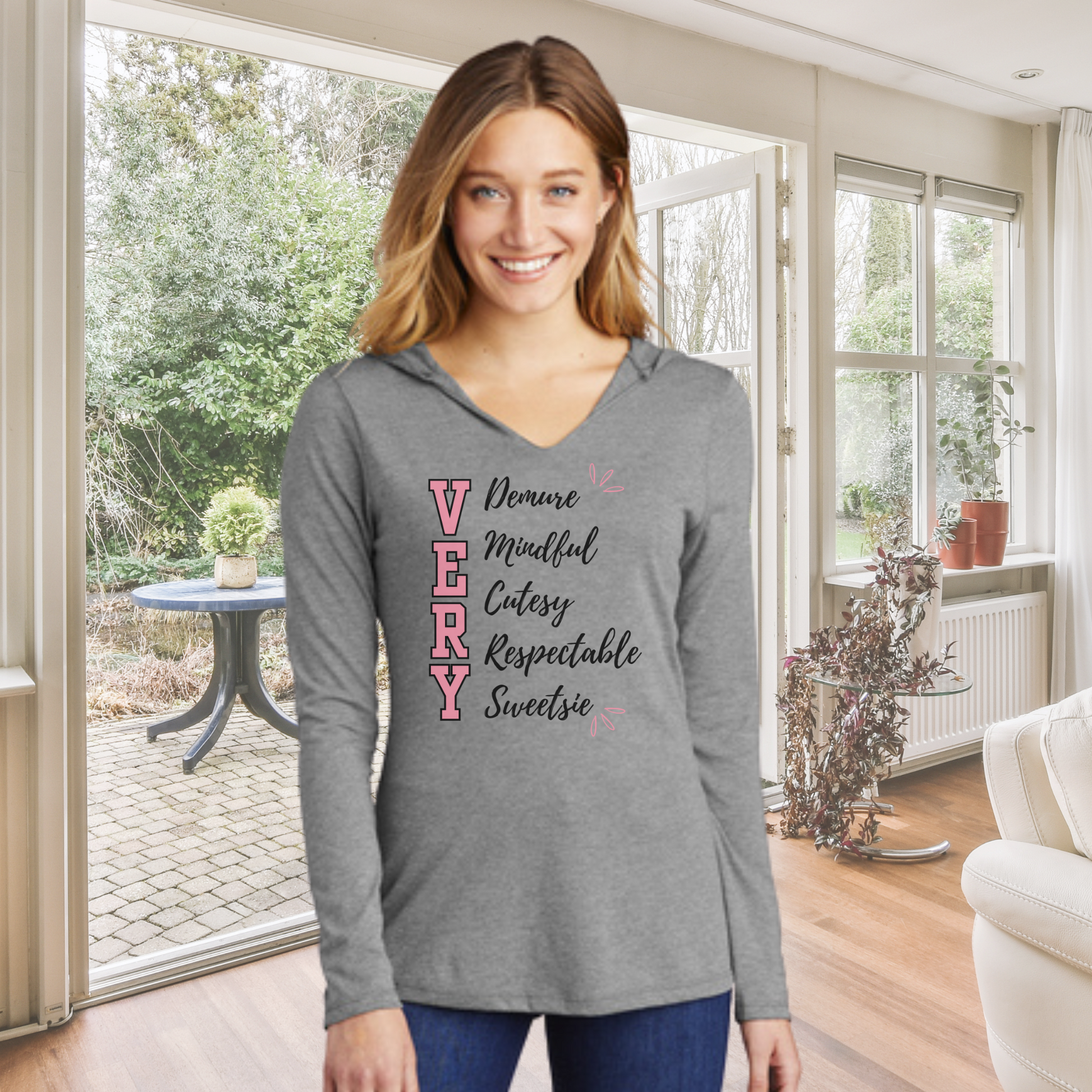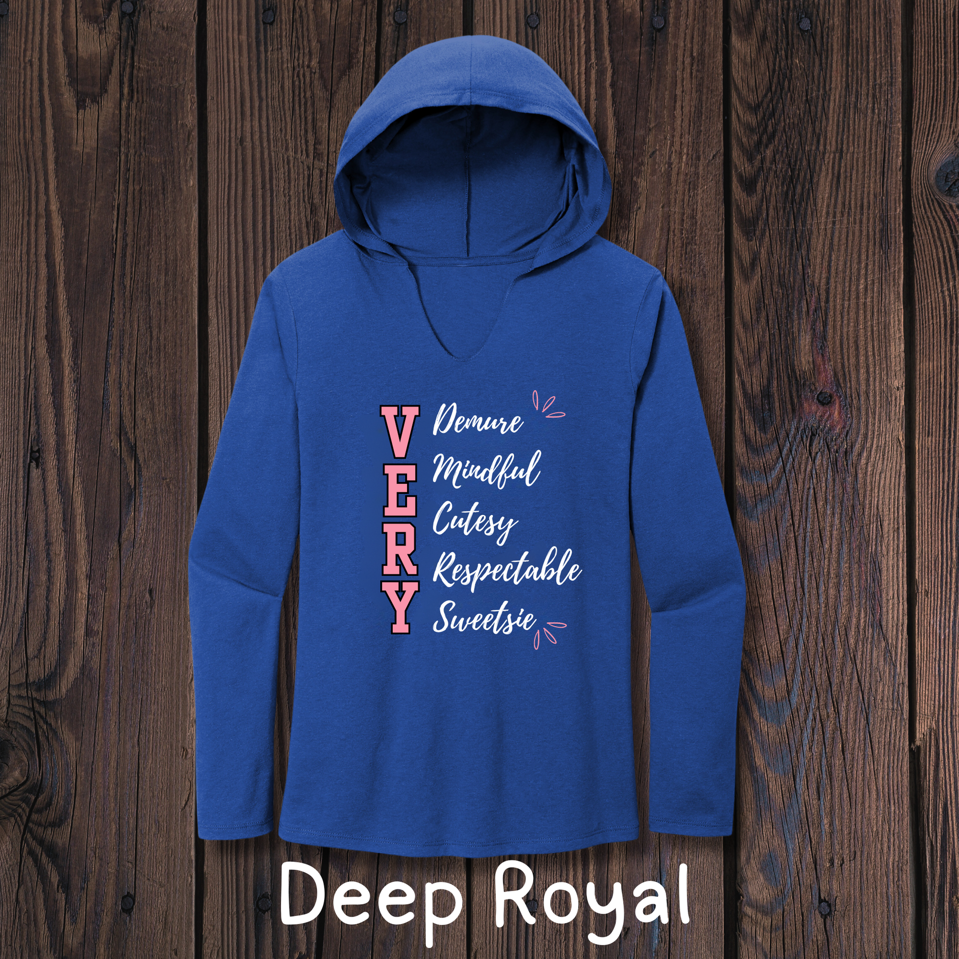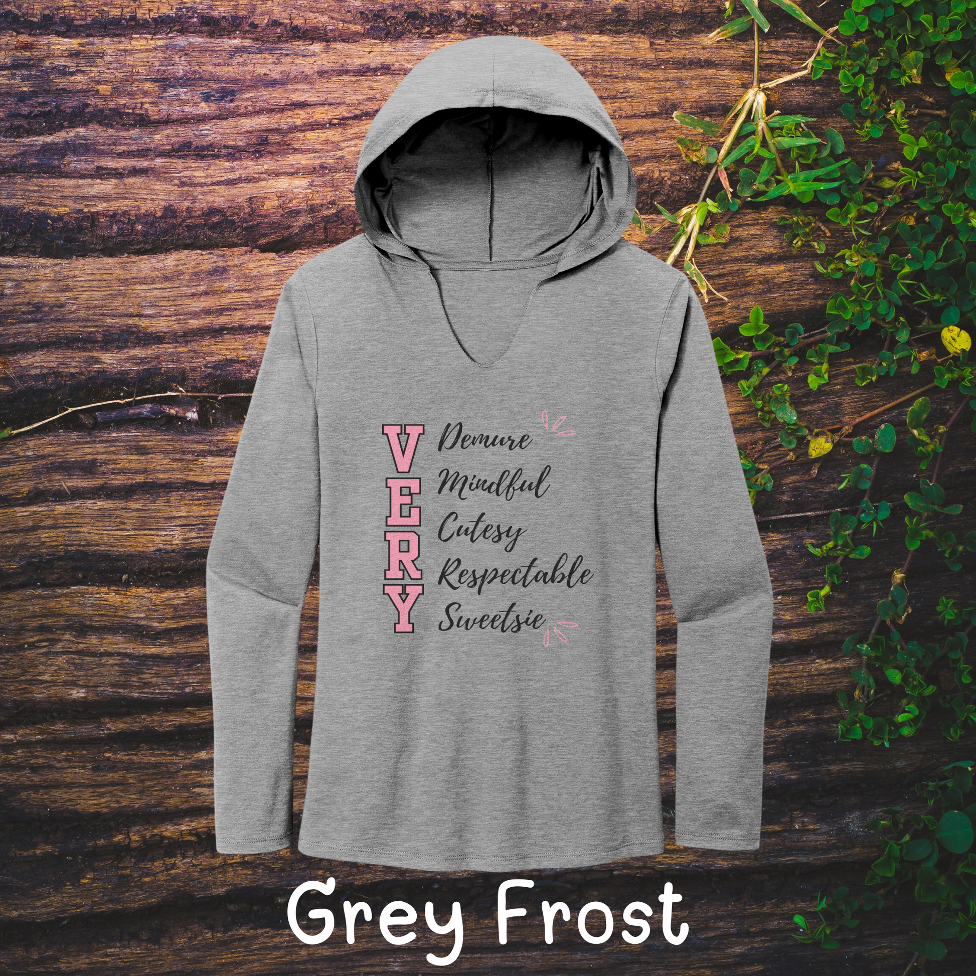 Comfy, quality long sleeve hoodie. Very Demure, Very Mindful, Very Cutesy, Very Respectable, Very Sweetsie. Wear this very cutesy sweatshirt and look very demure! Not like those other girls. Not too much! The perfect fusion of lightweight comfort and carefree style.