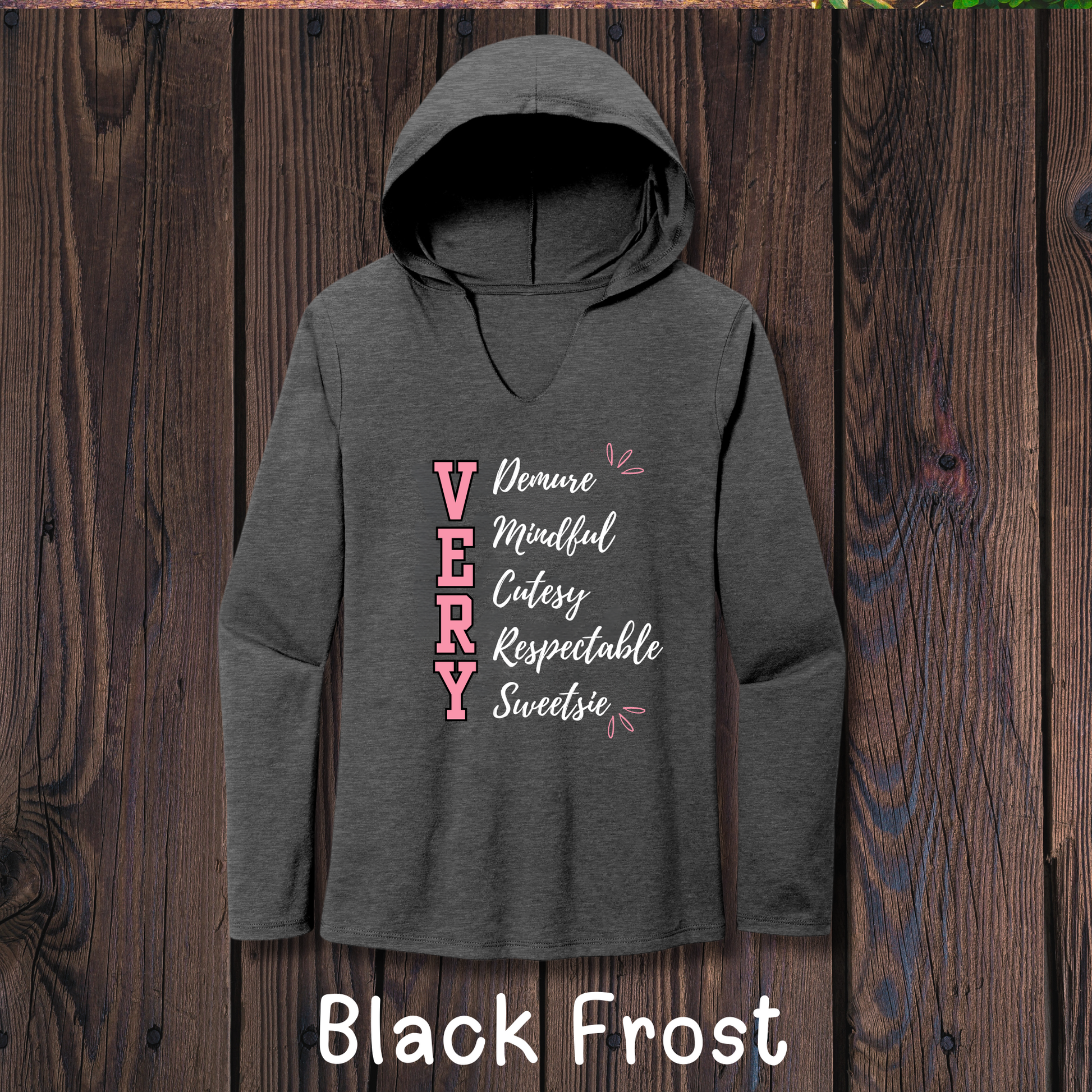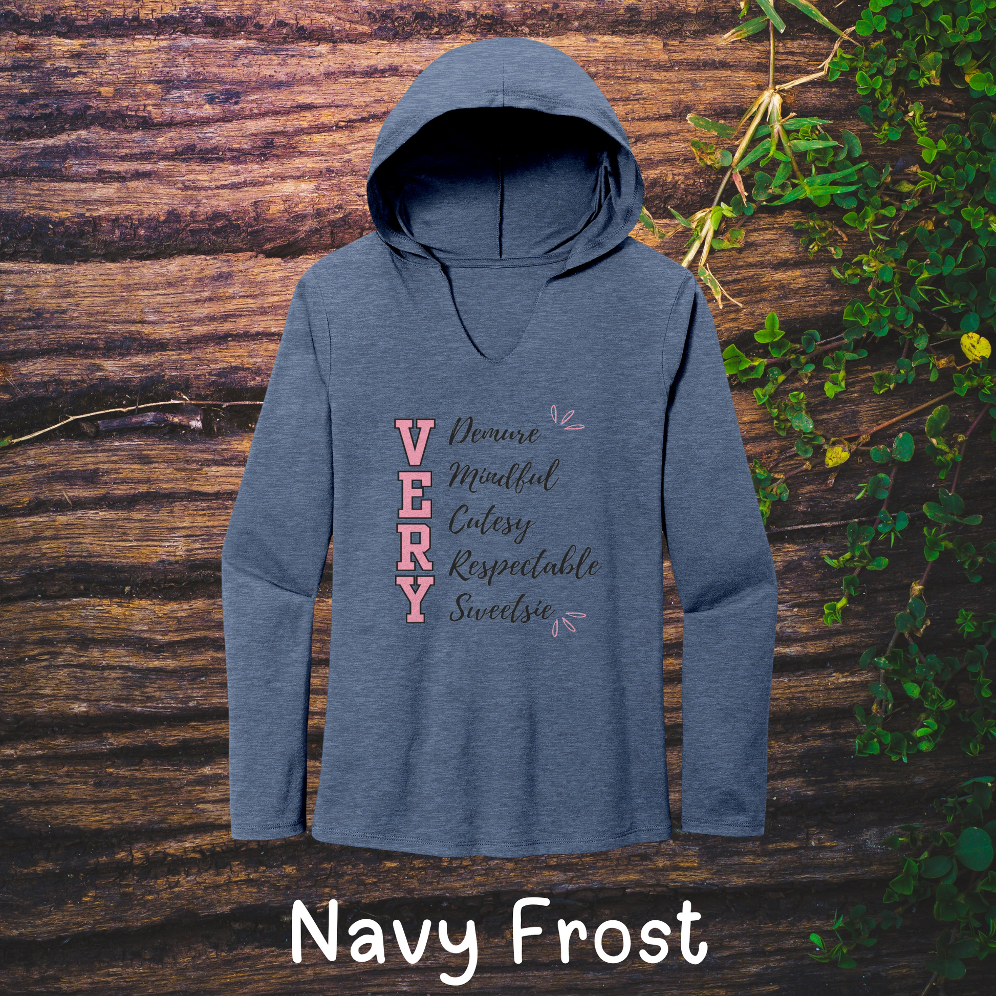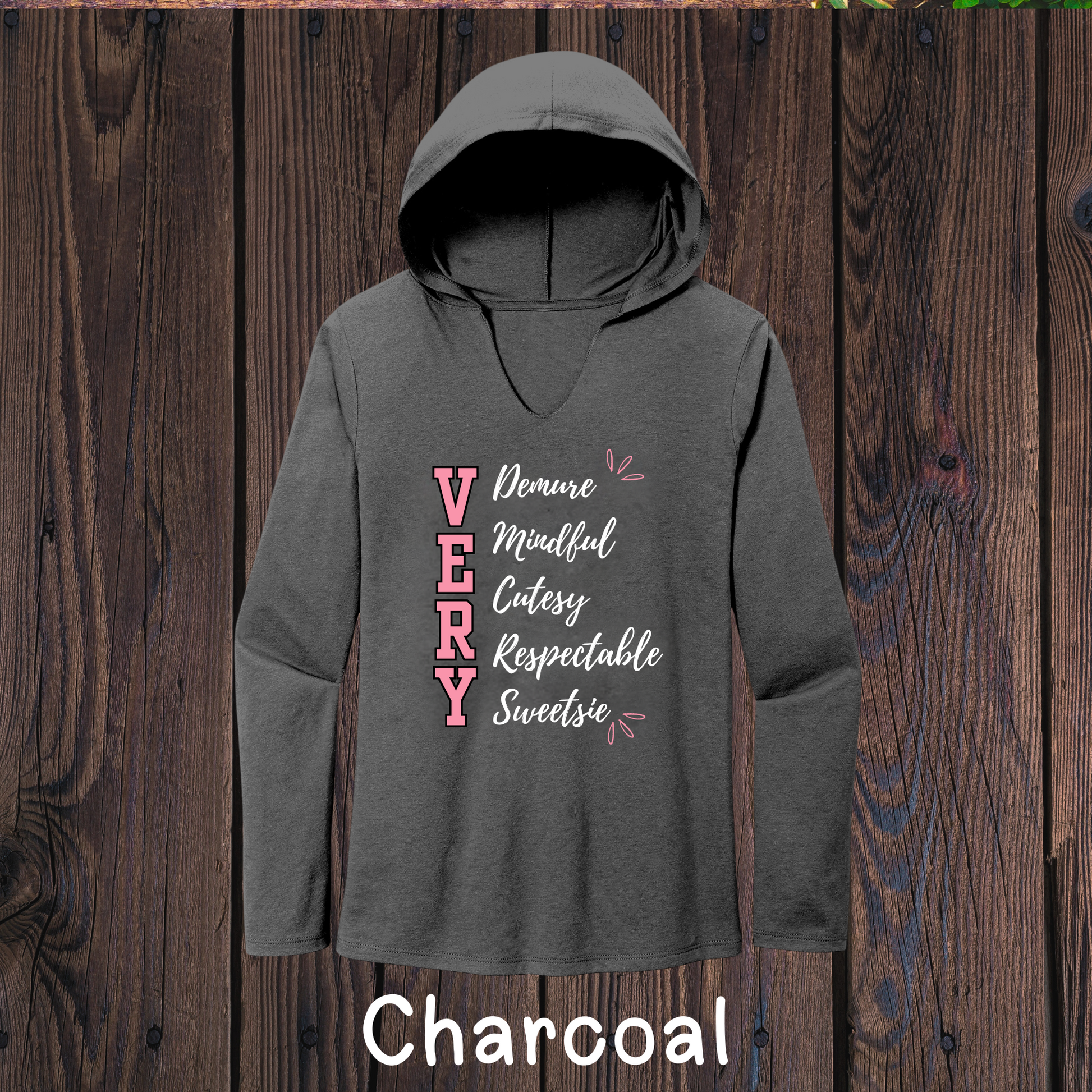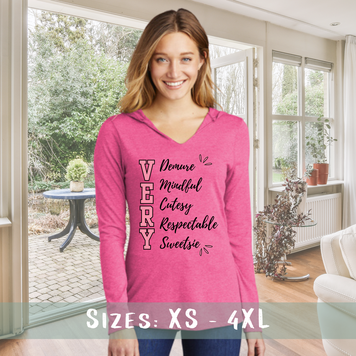 Comfy, quality long sleeve hoodie. Very Demure, Very Mindful, Very Cutesy, Very Respectable, Very Sweetsie. Wear this very cutesy sweatshirt and look very demure! Not like those other girls. Not too much! The perfect fusion of lightweight comfort and carefree style.