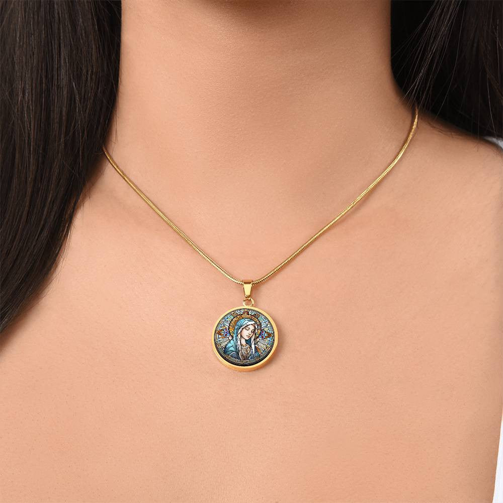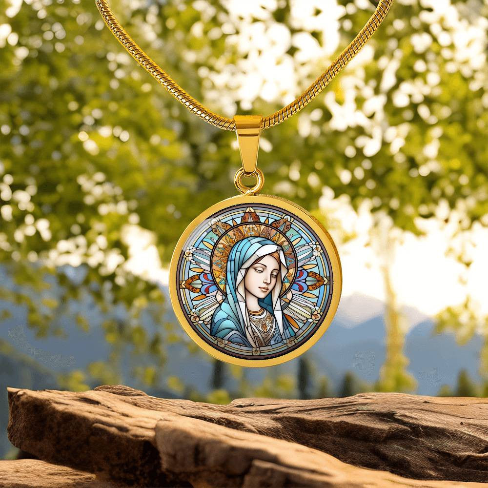 Virgencita - Virgin Mary Stained Glass Look Necklace: Immerse yourself in the tender embrace of maternal love with our portrayal of the Virgin Mary. This poignant scene is artfully rendered in stained glass style.