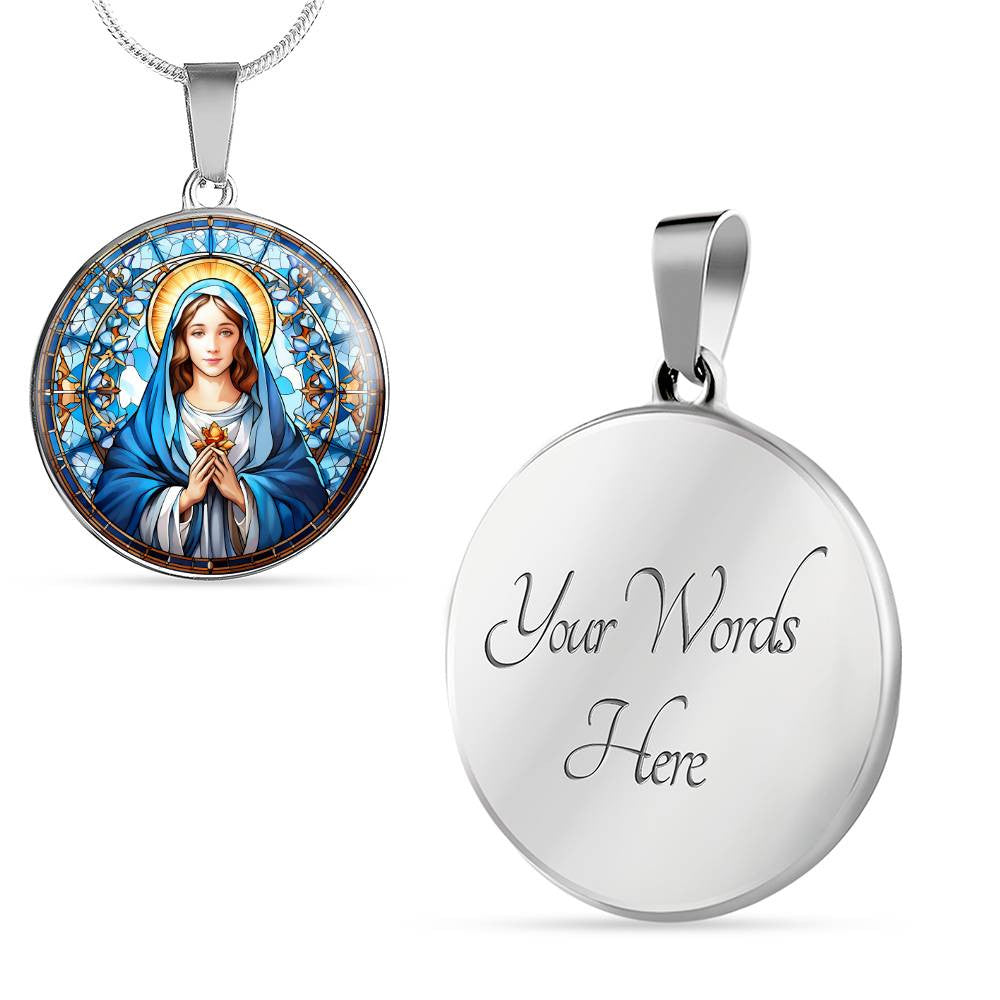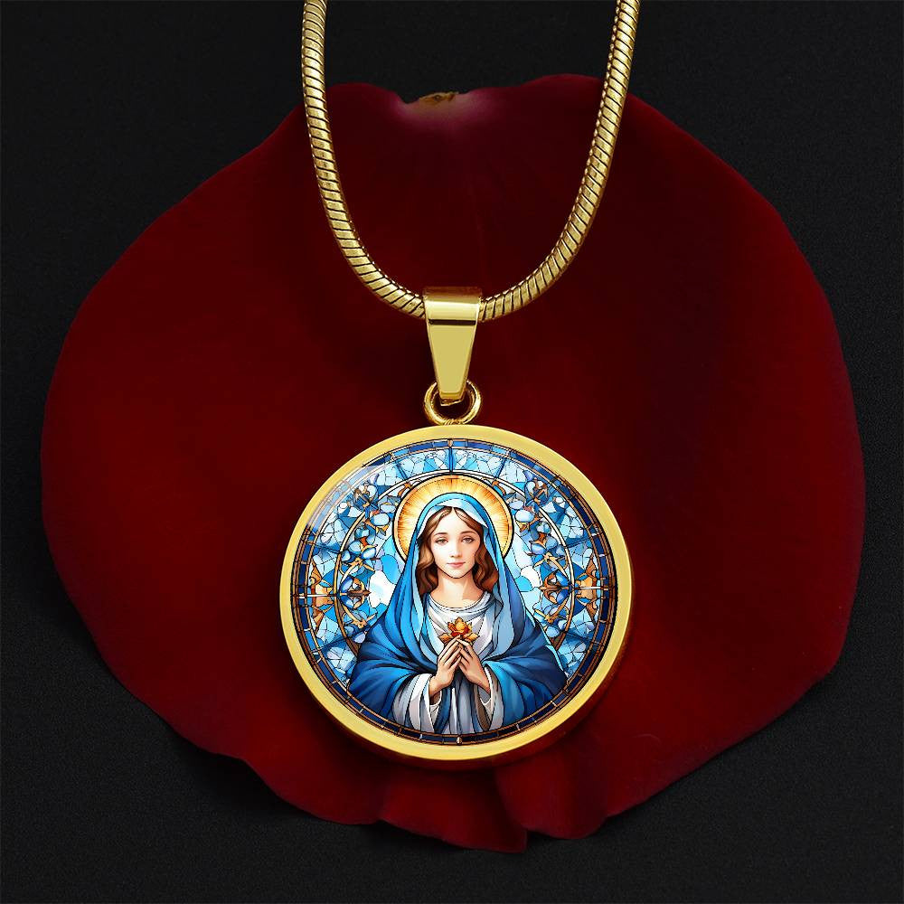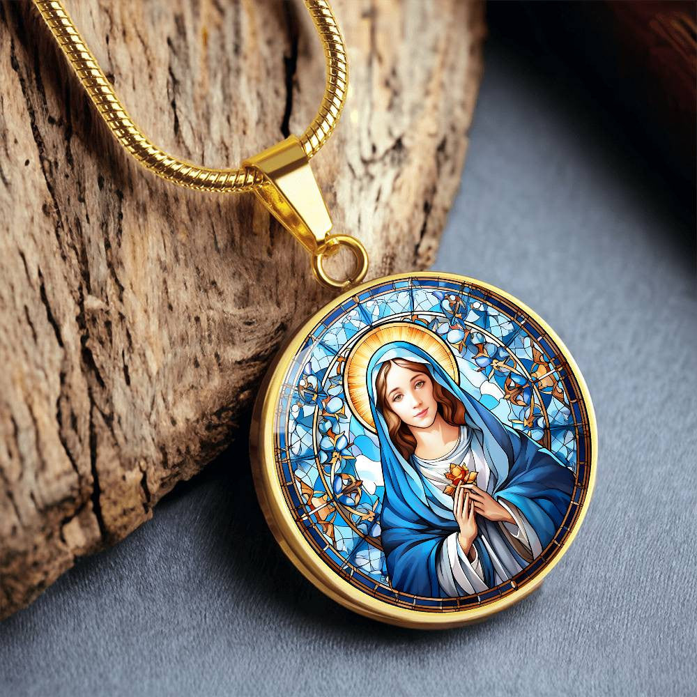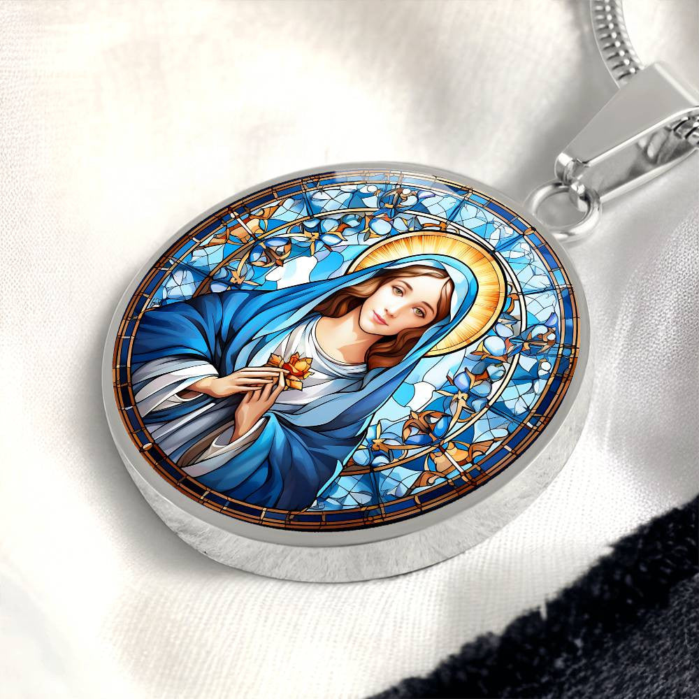 Virgen Mary Stained Glass Look Necklace: Immerse yourself in the tender embrace of maternal love with our portrayal of the Virgin Mary cradling baby Jesus. This poignant scene is artfully rendered in stained glass style.
