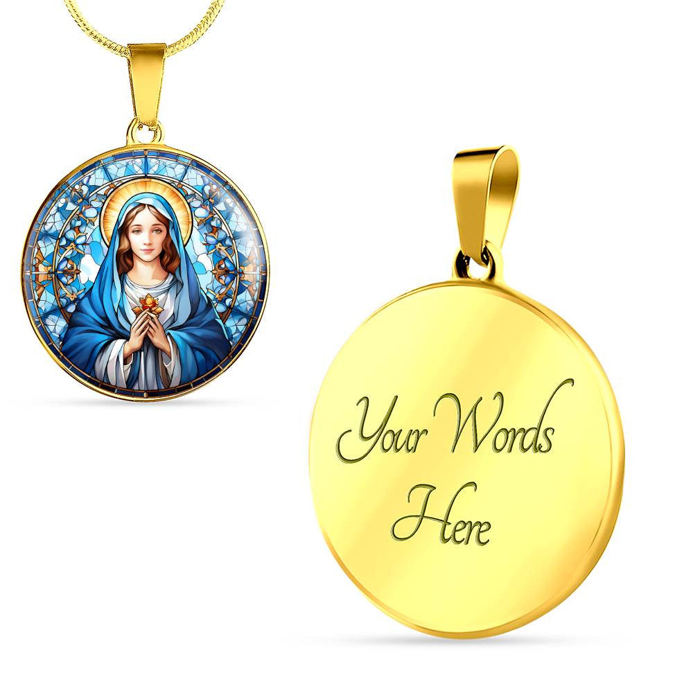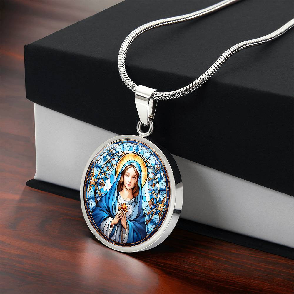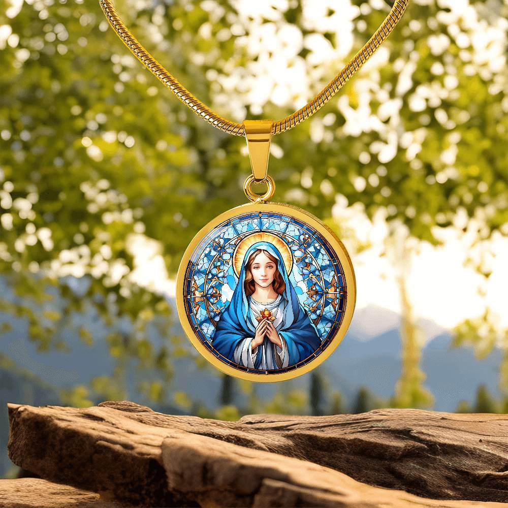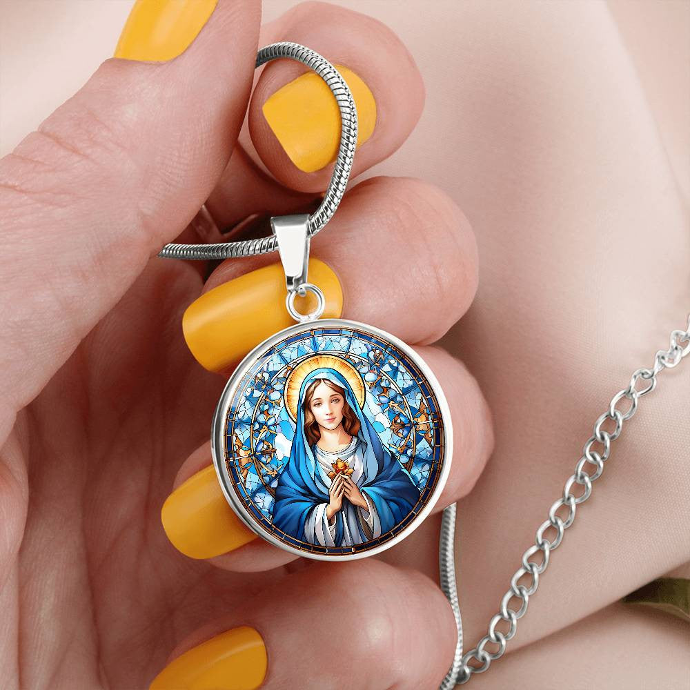 Virgen Mary Stained Glass Look Necklace: Immerse yourself in the tender embrace of maternal love with our portrayal of the Virgin Mary cradling baby Jesus. This poignant scene is artfully rendered in stained glass style.