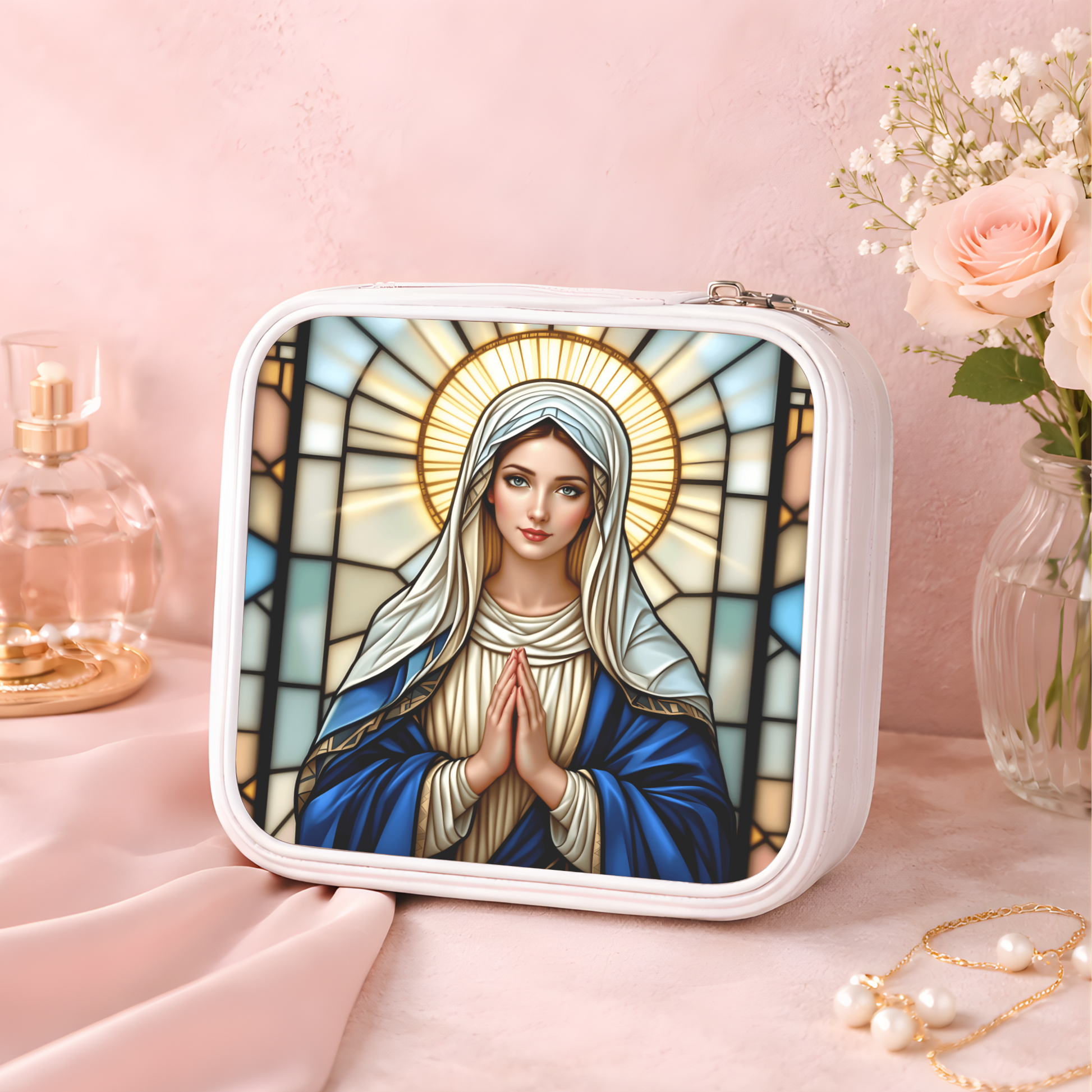 A beautiful Virgin Mary necklace or keychain featuring a graceful prayerful image of the Blessed Mother in a luminous stained glass inspired design. The soft ivory, blue, and gold tones create an elegant sacred-art look that feels peaceful, timeless, and deeply meaningful.